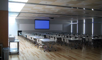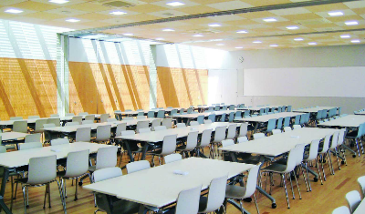 収容人数は最大270人、天井の高さは3m50cm。普段は食堂として利用。ホール前後にプロジェクターを備え、2分割して利用も可能な多目的ホール。